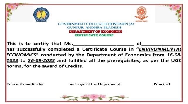 The department has designed and offered an Ability Enhancement Certificate Course, titled, “ Environmental Economics” for the Second Year III semester B.A (HEP,CE,PEP & FE), students. This course is offered as an introductory course for 30 days from 16-08-2023 to 26-09-2023. The course focuses on providing knowledge about the economic analysis of With out polluted Economic growth in India.