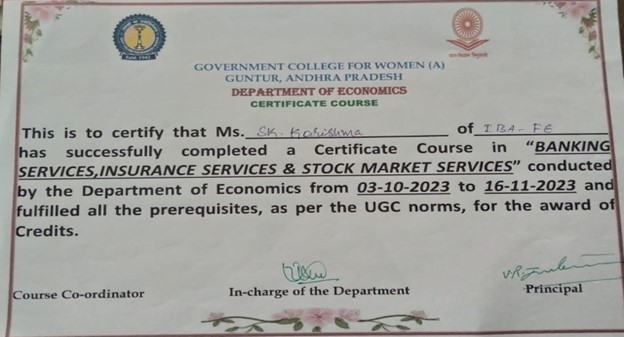The Department of Economics conducted ability enhancement certificate course on Banking, Insurance & Stock Markets offered for I BA, 2nd Semester Single Major course students